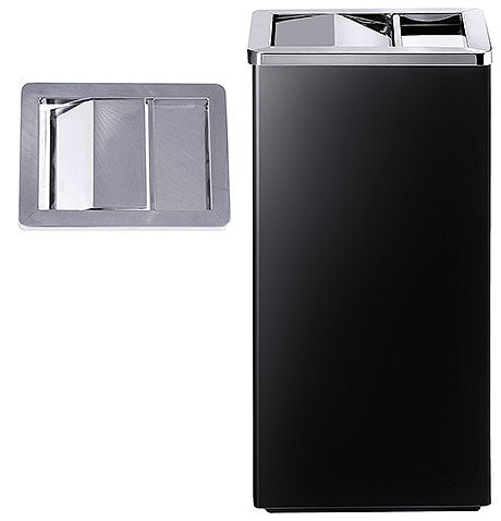 Standaschenbecher, aus matt schwarz lackiertem Stahlblech, Klappe und Becher oben aus Edelstahl, kurzer verzinkter Innenbehälter